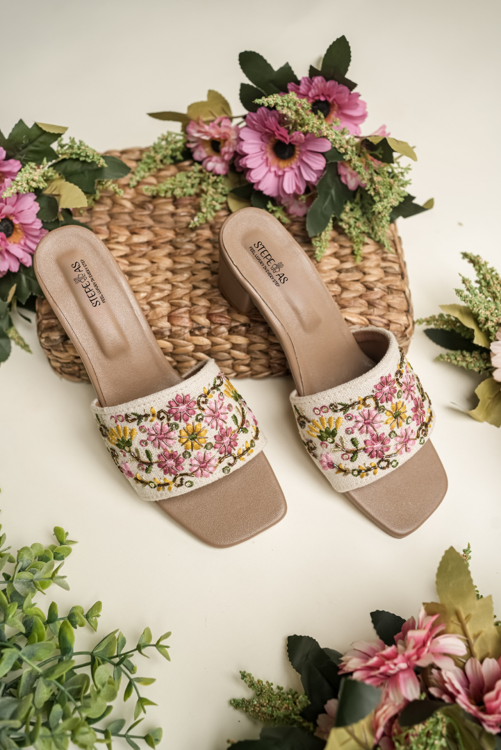 Elevate your height and your style with Stepellas Floral Embroidered Block Heels. These elegant beige sandals feature vibrant pink and yellow floral threadwork on a premium fabric strap. With a sturdy, comfortable block heel and a modern square-toe design, these Stepellas heels are perfect for weddings, garden parties, or festive celebrations. Experience luxury in every step with our signature cushioned footbed.
